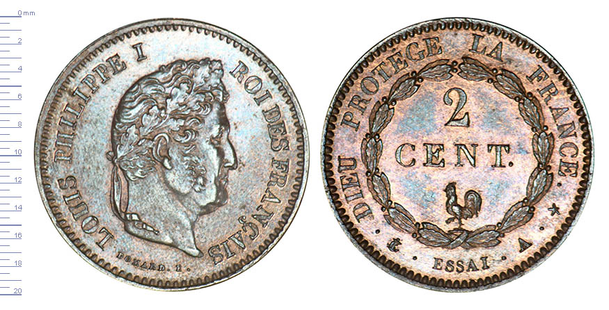 2 CENT. Louis-Philippe I, ESSAI type ''Dieu protège la France'' (1831-42)