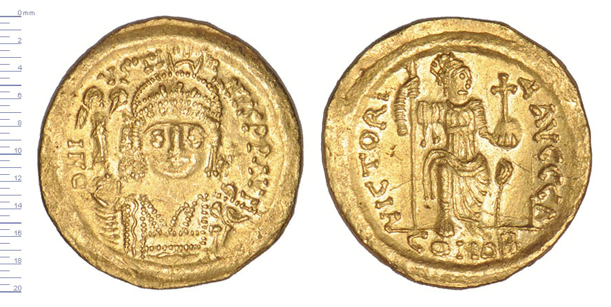 Solidus : Buste de Justin II sans barbe, tenant une Victoire sur un globe - R/: Constantinople assise de face tenant une lance & un globe crucigère (R 752-7)