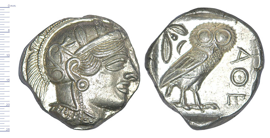 Athènes, (Marathon 490-407) : Tétradrachme à la tête d'Athéna - R/: Chouette debout regardant de face (proche de BMC 82sq)
